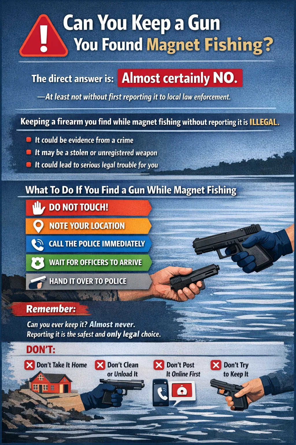 คำตอบสั้น ๆ คือ: เกือบจะไม่อย่างแน่นอน อย่างน้อยก็ไม่ใช่โดยไม่ต้องรายงานเรื่องนี้ต่อหน่วยงานบังคับใช้กฎหมายในพื้นที่ก่อน ในรัฐส่วนใหญ่ของสหรัฐอเมริกา เช่นเดียวกับในสหราชอาณาจักร แคนาดา และออสเตรเลีย การเก็บอาวุธปืนที่คุณดึงขึ้นมาจากน้ำด้วยแม่เหล็กตกปลาโดยไม่รายงานว่าผิดกฎหมาย ปืนอาจเป็นหลักฐานในการก่ออาชญากรรม ถูกรายงานว่าถูกขโมย หรืออาวุธที่ไม่ได้จดทะเบียน ซึ่งสิ่งเหล่านี้ก่อให้เกิดความเสี่ยงทางกฎหมายอย่างร้ายแรงสำหรับคุณทันทีที่คุณตัดสินใจเดินออกไป