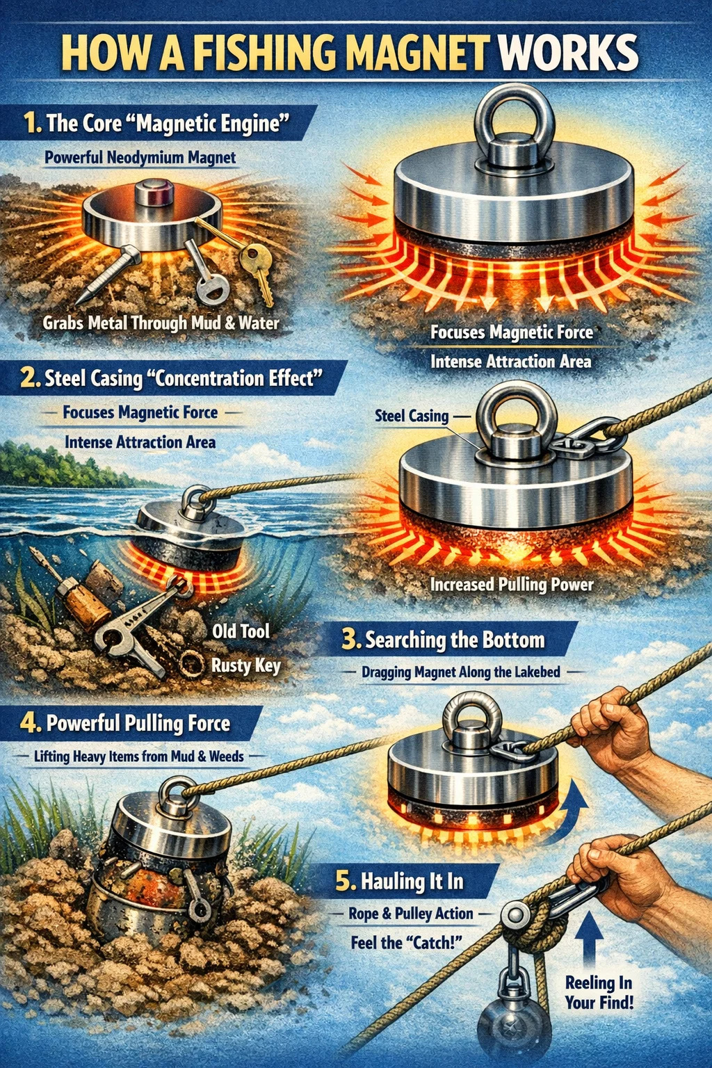 เพื่อทำความเข้าใจวิธีการก แม่เหล็กตกปลา ใช้งานได้ คุณสามารถจินตนาการว่ามันเป็น "เครื่องดูดฝุ่นใต้น้ำ" ที่มีพลังพิเศษ ยกเว้นว่ามันจะดูดโลหะแทนฝุ่น