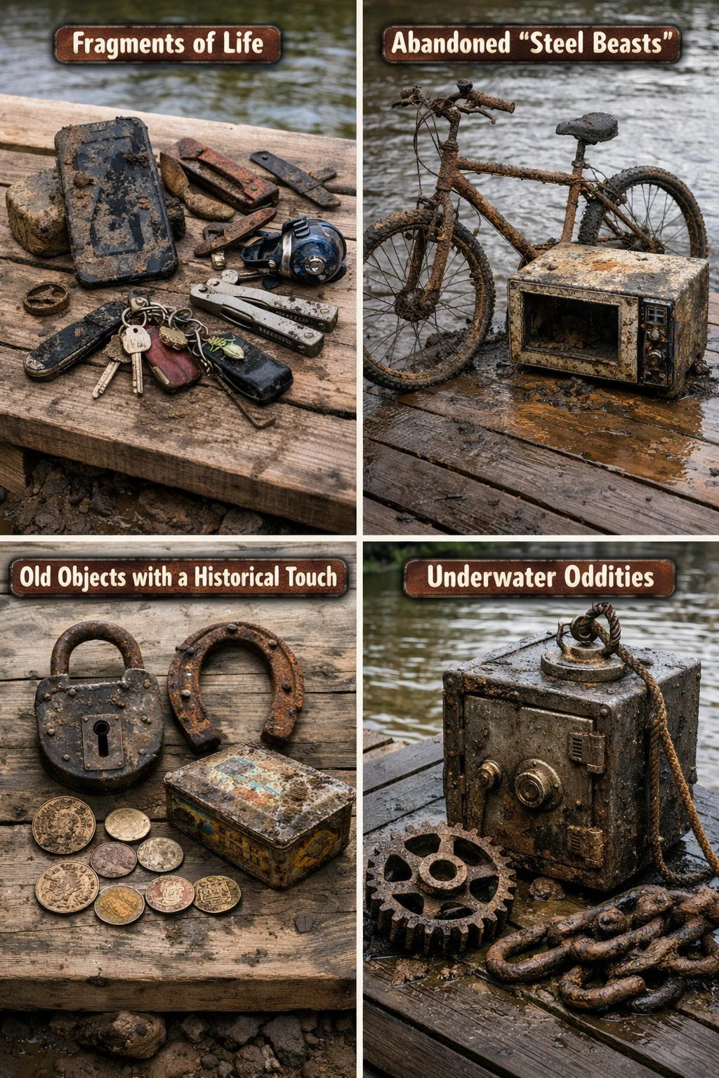 ชิ้นส่วนอุตสาหกรรม: เฟืองขนาดใหญ่ โซ่ขึ้นสนิม หรือชิ้นส่วนเครื่องจักรในโรงงานบางประเภทที่ไม่สามารถจดจำชื่อได้อีกต่อไป ตู้เซฟและกล่องโลหะ: การค้นพบตู้เซฟมักเป็นจุดเด่นของการตกปลาแบบแม่เหล็ก และถึงแม้จะมีเพียงโคลนและทรายก็ตาม ความรู้สึกถึงความสำเร็จจากการสำรวจสิ่งที่ไม่รู้จักก็ไม่มีใครเทียบได้