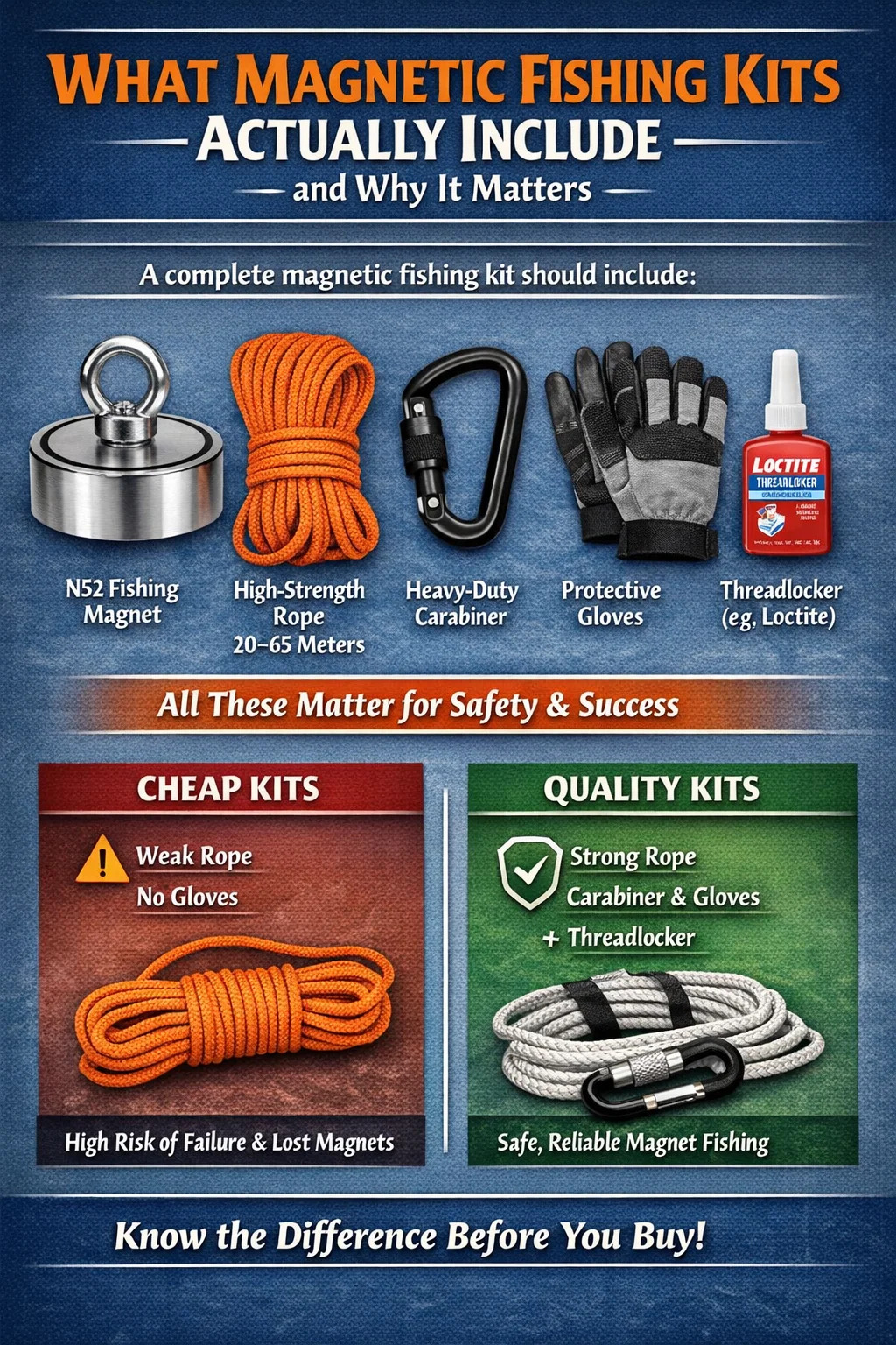 ชุดอุปกรณ์ตกปลาแบบแม่เหล็กระดับมืออาชีพเป็นมากกว่าแม่เหล็กขนาดใหญ่เพียงตัวเดียว มักประกอบด้วยแม่เหล็กตกปลาสองด้านที่มีแรงดึงรวม 1,000–1,500 ปอนด์ เชือกยาว 30–65 เมตรพร้อมความต้านทานการแตกหัก 3,000 ปอนด์ ตะขอเกี่ยวสำหรับการดึงคืนที่ไม่ใช่เหล็ก คาราไบเนอร์หลายอัน ถุงมือหนัก กระเป๋าถือ และบางครั้งก็มีแม่เหล็กขนาดเล็กที่สองสำหรับงานที่มีรายละเอียด อุปกรณ์ระดับพรีเมียมบางชิ้นมีแม่เหล็กหม้อดินหายากที่ออกแบบมาโดยเฉพาะสำหรับการลากในแนวนอน ซึ่งเป็นเครื่องมือที่แตกต่างจากแม่เหล็กตกปลามาตรฐานซึ่งดีเยี่ยมในสภาพแวดล้อมที่มีตะกอนหนัก