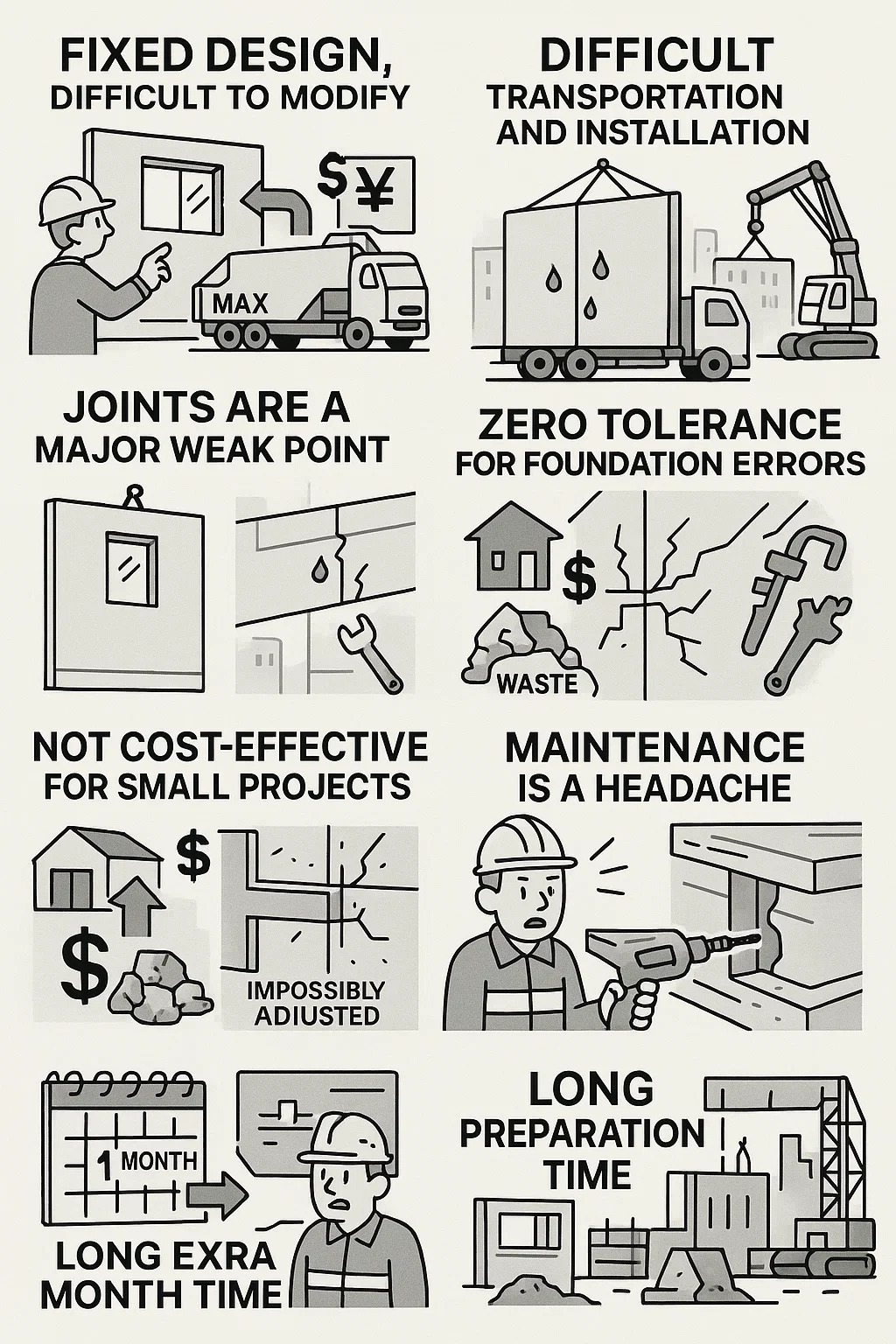 วงจรการออกแบบที่ยาวนาน: รายละเอียดทั้งหมดจะต้องได้รับการสรุปก่อนการก่อสร้างจะเริ่มขึ้น และต้องตรวจสอบแบบร่างซ้ำๆ ซึ่งใช้เวลานานกว่าหนึ่งเดือนเมื่อเทียบกับการก่อสร้างแบบหล่อในที่