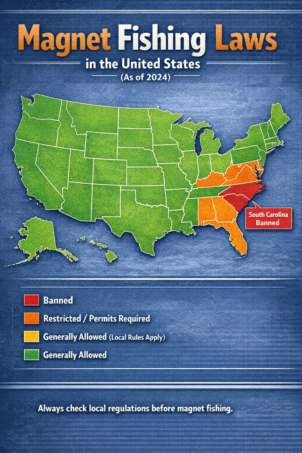 ปัจจุบันรัฐส่วนใหญ่ของสหรัฐอเมริกาอนุญาตให้มีการจับปลาด้วยแม่เหล็กโดยไม่มีการห้ามในระดับรัฐโดยเฉพาะ ณ ปี 2024 มีเพียงเซาท์แคโรไลนาเท่านั้นที่มีการสั่งห้ามการจับปลาแบบแม่เหล็กทั่วทั้งรัฐอย่างชัดเจน ทำให้เป็นค่าผิดปกติที่ชัดเจน อย่างไรก็ตาม "อนุญาตโดยค่าเริ่มต้น" ไม่ได้หมายความว่าไม่จำกัด รัฐหลายสิบรัฐมีกฎระเบียบทางน้ำ ข้อกำหนดใบอนุญาต หรือข้อบัญญัติท้องถิ่นที่ส่งผลโดยตรงต่อสถานที่และวิธีที่คุณสามารถใช้แม่เหล็กตกปลาได้ ก่อนที่คุณจะผูกแม่เหล็กนีโอไดเมียมเข้ากับเชือกแล้วปล่อยลงในแม่น้ำ คุณต้องเข้าใจไม่เพียงแต่กฎหมายของรัฐเท่านั้น แต่ยังรวมถึงกฎของเทศมณฑล กรรมสิทธิ์ที่ดิน และแหล่งน้ำเฉพาะที่คุณกำหนดเป้าหมายด้วย