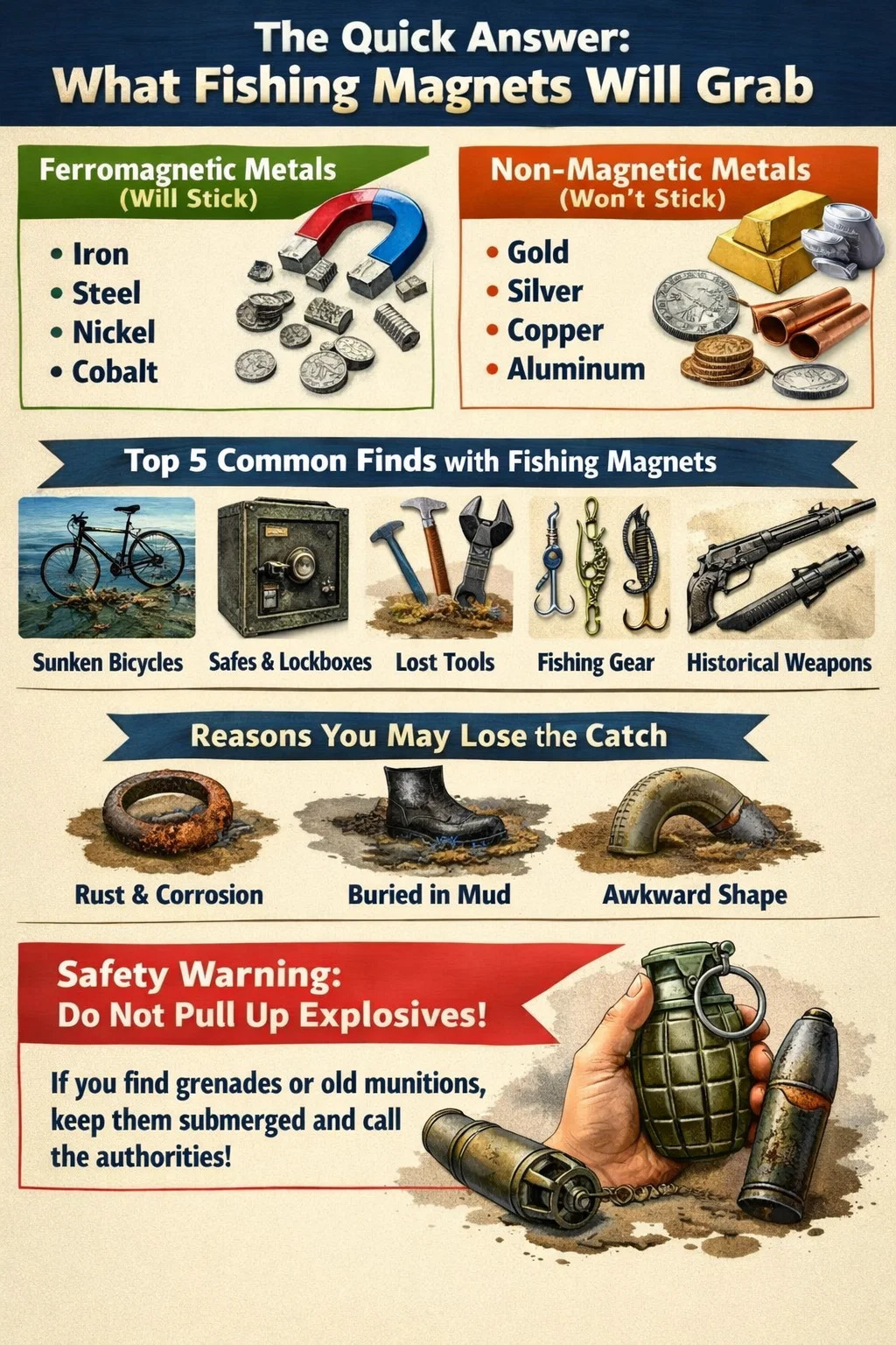 ทรงพลัง แม่เหล็กตกปลา ได้รับการออกแบบมาให้รับใด ๆ วัสดุแม่เหล็กไฟฟ้า ซึ่งโดยหลักประกอบด้วยเหล็ก เหล็กกล้า นิกเกิล และโคบอลต์ ในสถานการณ์ในโลกแห่งความเป็นจริง สิ่งนี้แปลเป็นวัตถุที่จมอยู่มากมายอย่างไม่มีที่สิ้นสุด เช่น จักรยาน เครื่องมือ ตู้เซฟ เหรียญที่มีแกนเหล็ก อาวุธโบราณ และเศษอุตสาหกรรม . สิ่งสำคัญคือต้องเข้าใจว่าจะไม่จับโลหะที่ไม่ใช่แม่เหล็ก เช่น ทองคำ เงิน ทองแดง หรืออะลูมิเนียม